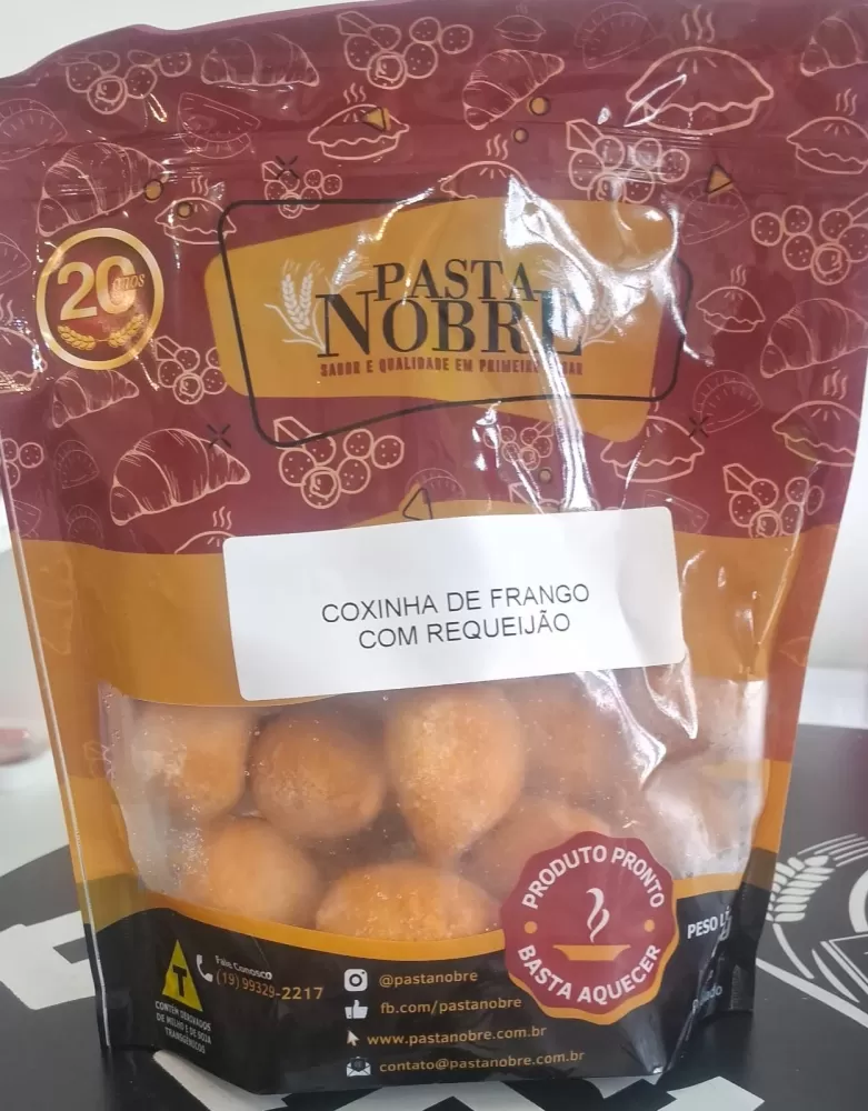 Aprecie a autêntica coxinha de frango Pasta Nobre: massa macia, recheio generoso de frango temperado artesanalmente e sabor marcante em cada pedaço. Perfeita para lanches e momentos especiais, já pronto, apenas aquecer!. Experimente a praticidade e o sabor que conquistam paladares exigentes. Pacote com 400 gramas.