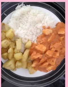 STROGONOFF DE FRANGO COM ARROZ BRANCO E BATATA ASSADA COM ERVAS