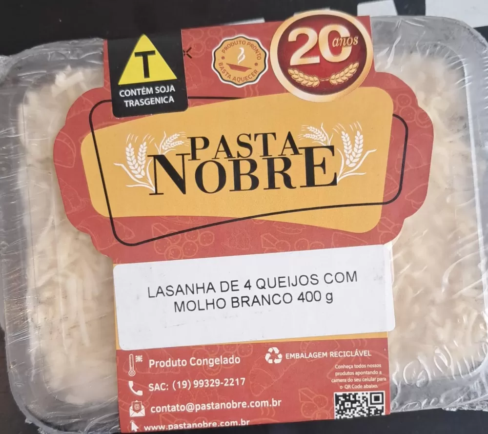 Camadas de massa macia intercaladas com um blend equilibrado de quatro queijos selecionados — muçarela, parmesão, provolone e gorgonzola — envolvidos por um molho branco aveludado (bechamel). Finalizada com cobertura de queijos para gratinar, entrega aquele derretido elástico por cima e um interior ultra cremoso. Clássico reconfortante, pronto em minutos: é só aquecer e comer.